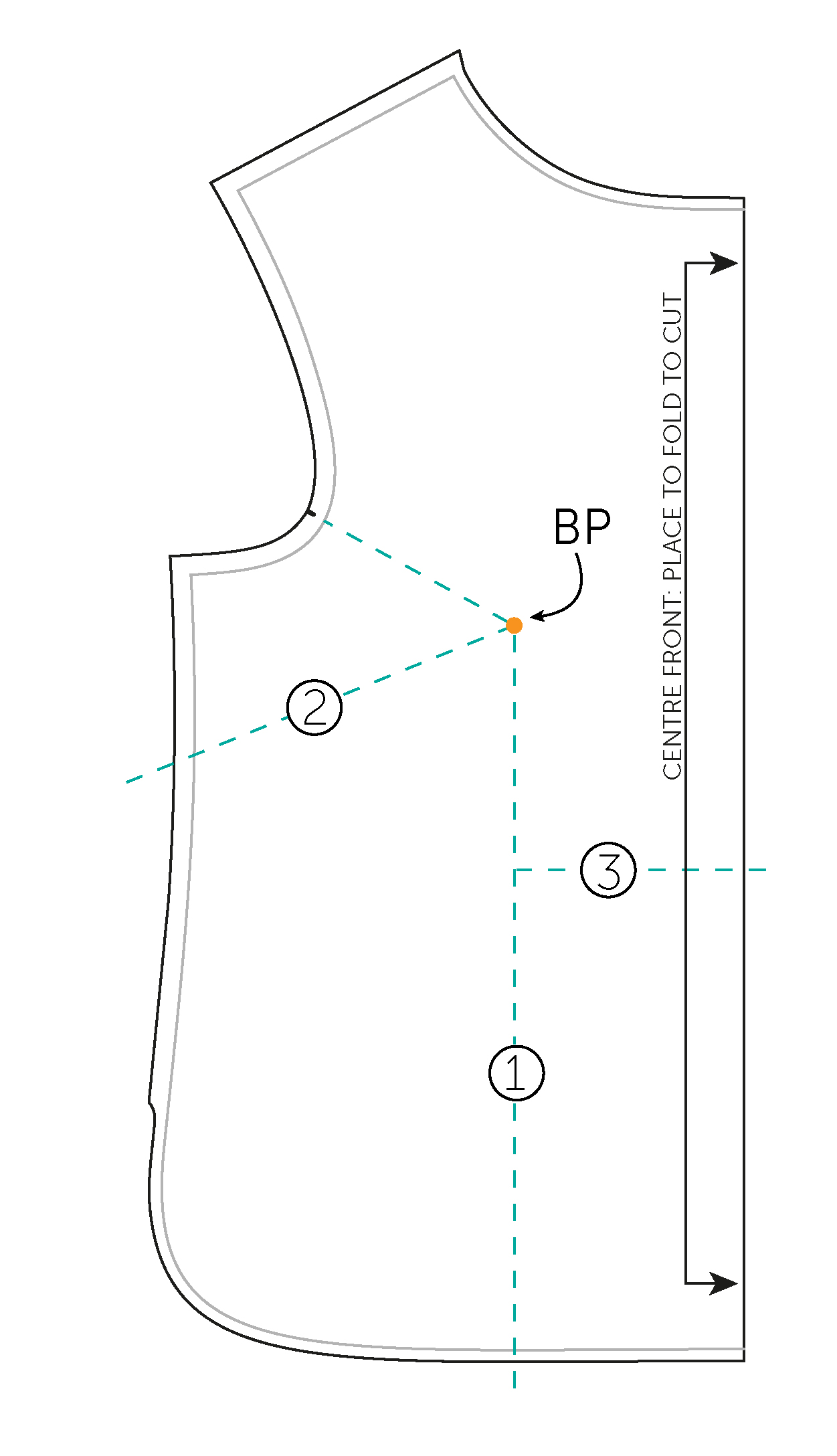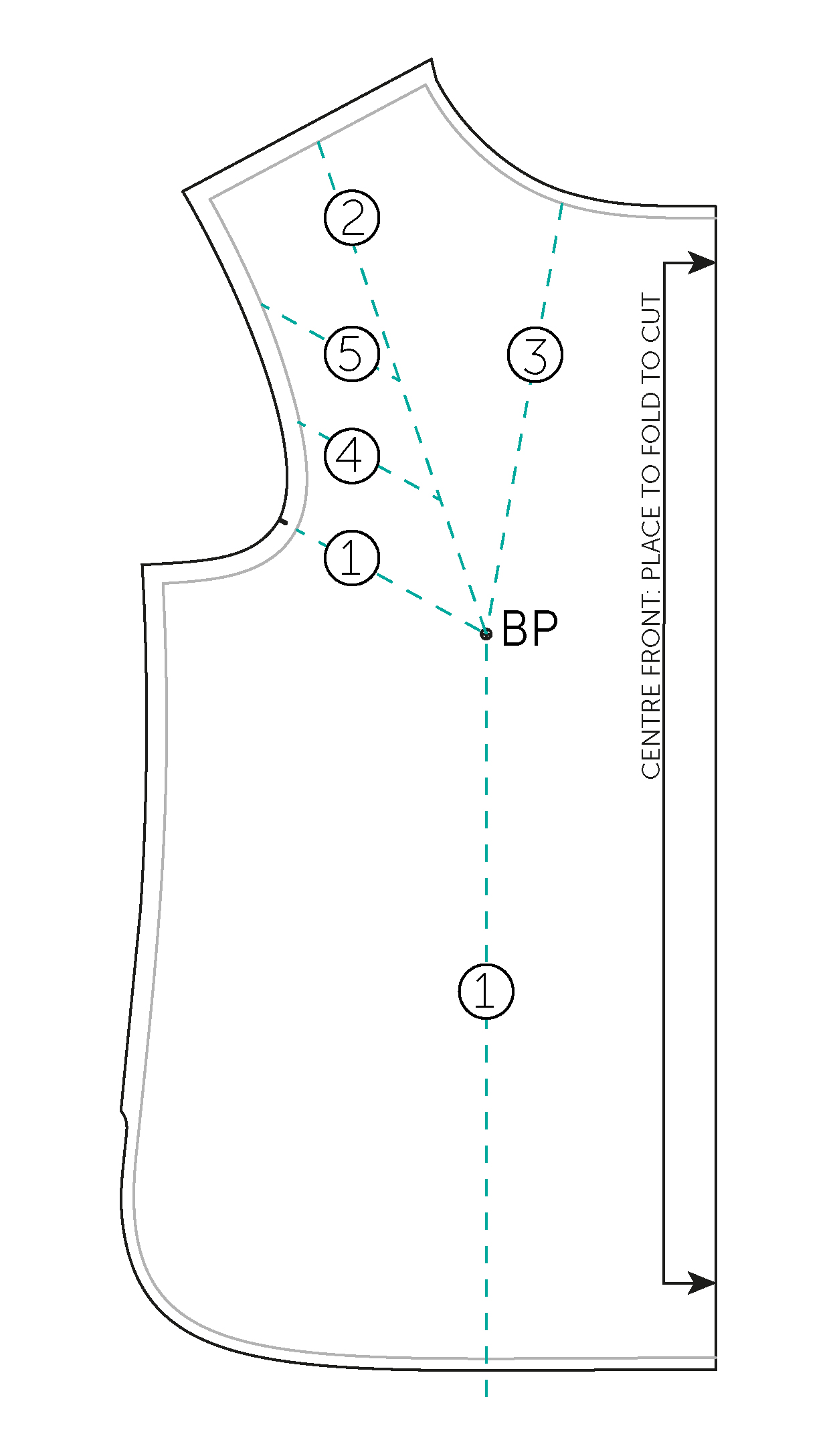 - LINE 1: Draw a line from the BUST POINT (BP) right down to the hem, parallel with the CENTRE FRONT LINE. Draw a line from the BP to a point about a ⅓ of the way along the armhole.