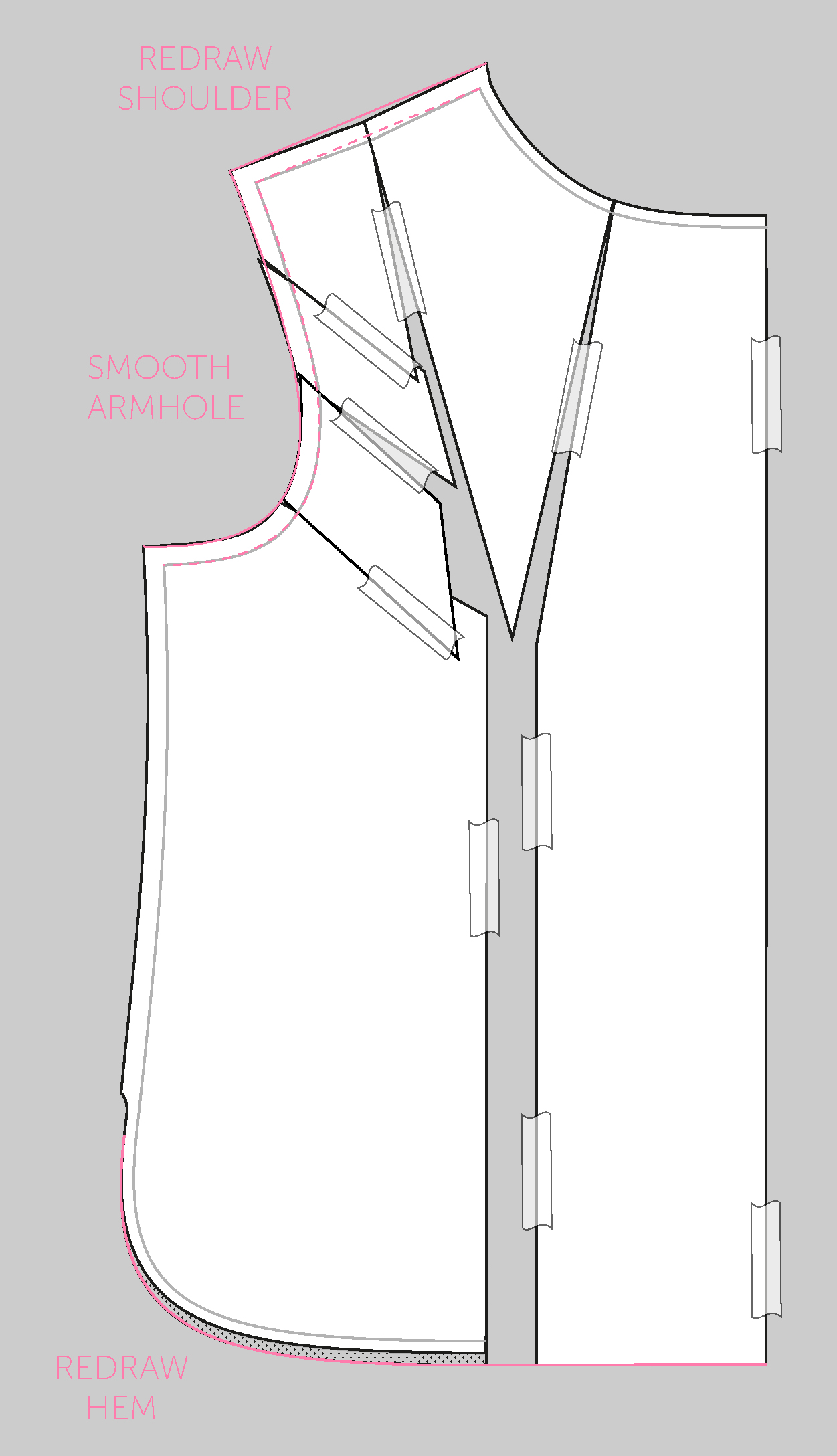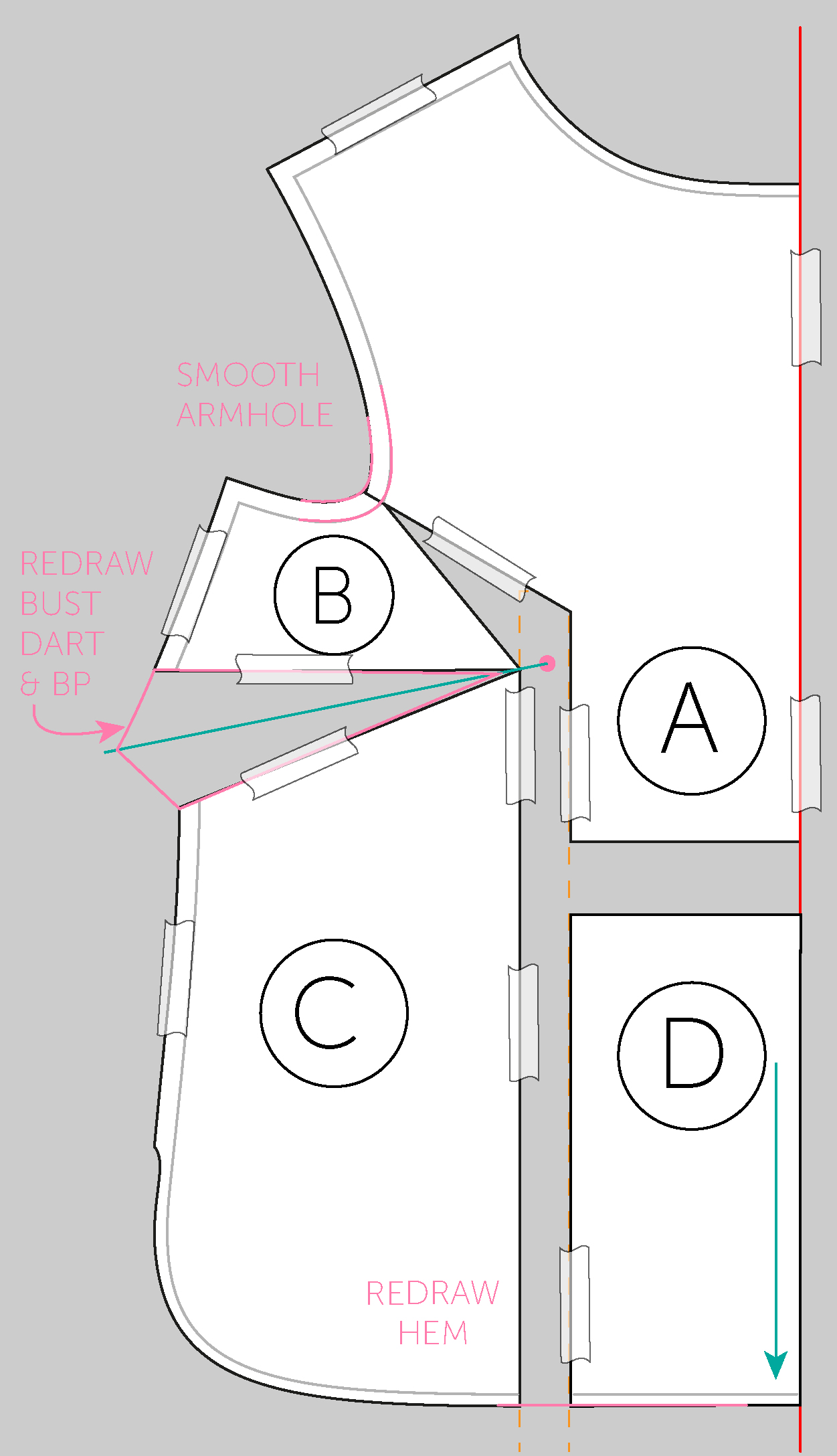 Tape everything down and redraw the bust dart and shoulder seam and smooth the armhole curve.