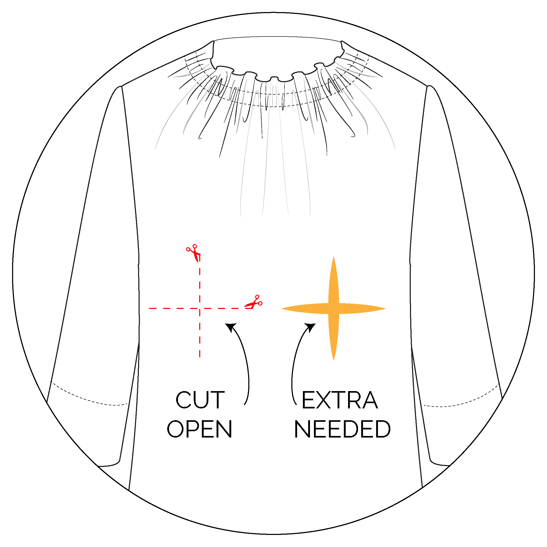 - Cut along LINE 3 leaving a hinge at the neckline stitch line.