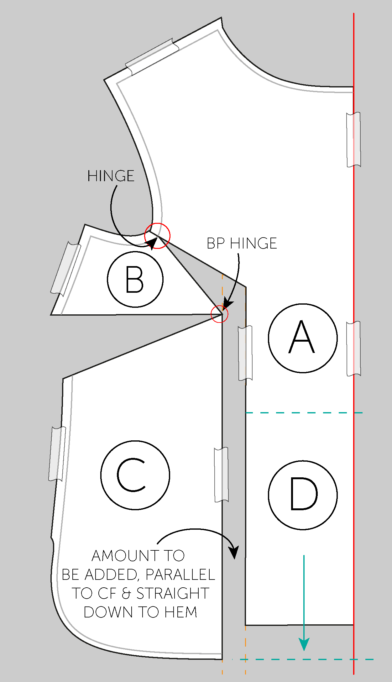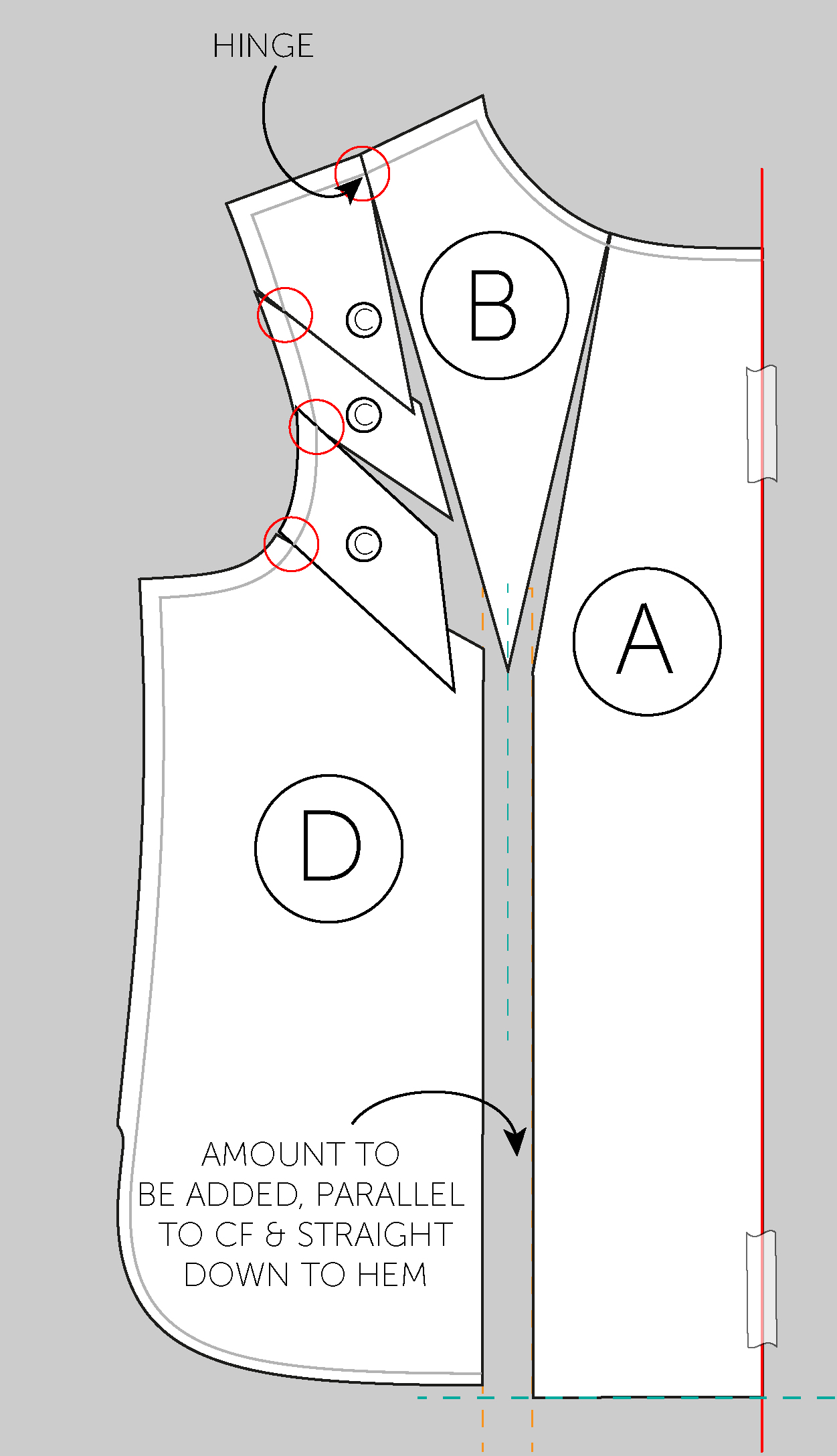 Place some paper behind your pattern pieces. Draw a line on your paper (shown in red). Anchor down section A and D with tape or pins (bear in mind, D will have to move again), lining up the pattern CF with the one you just drew. Draw a couple of lines to show the amount being added (the orange lines), keep them parallel with CF.
