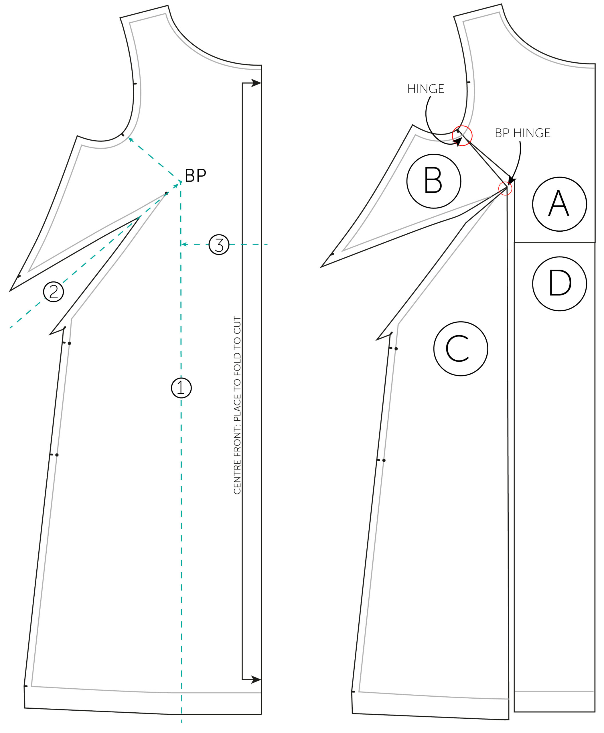 - Cut along LINE 2 through the centre of the bust dart towards the BP, leaving a hinge at BP.