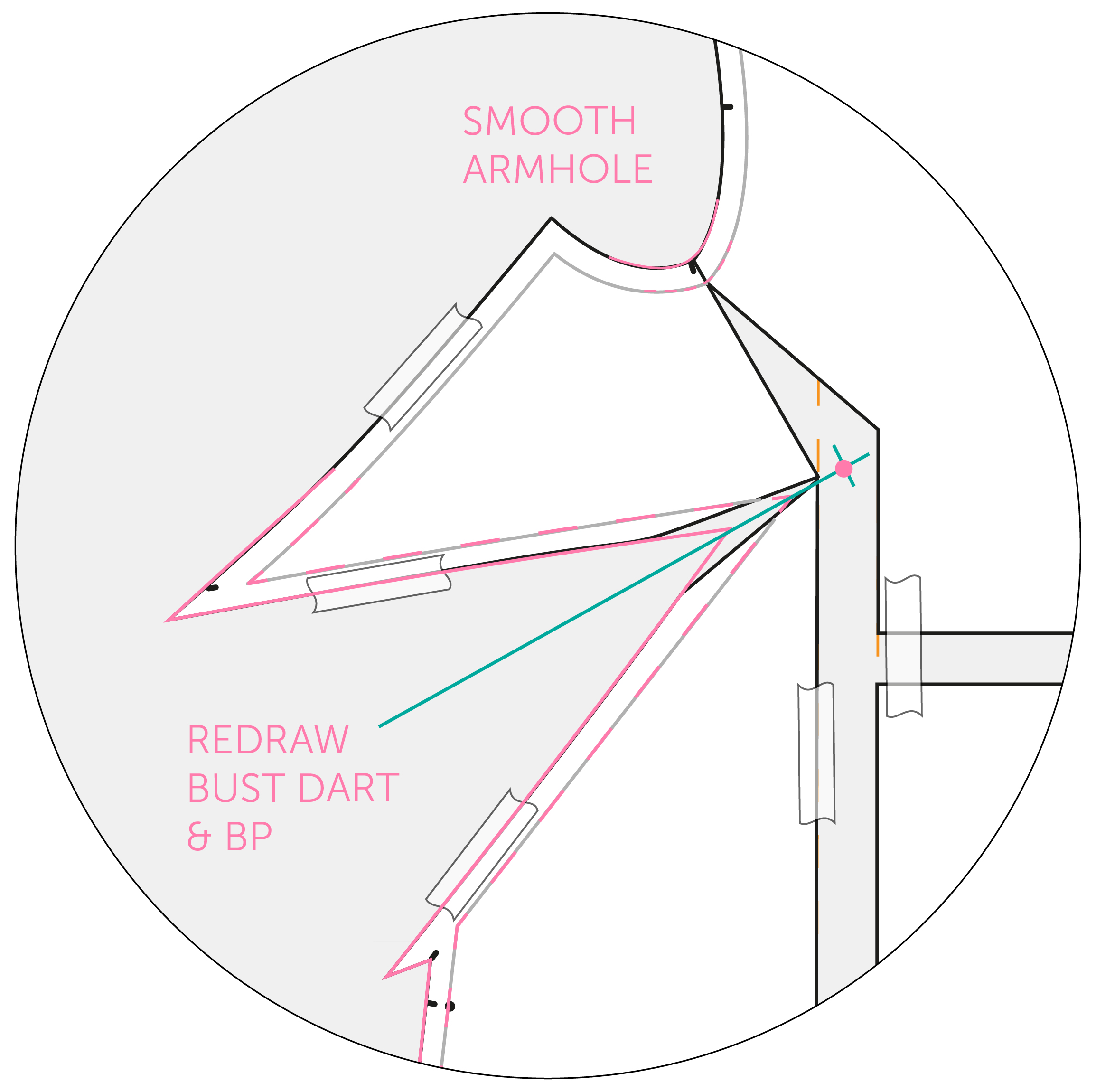 Tape everything down and redraw the bust dart and shoulder seam and smooth the armhole curve.