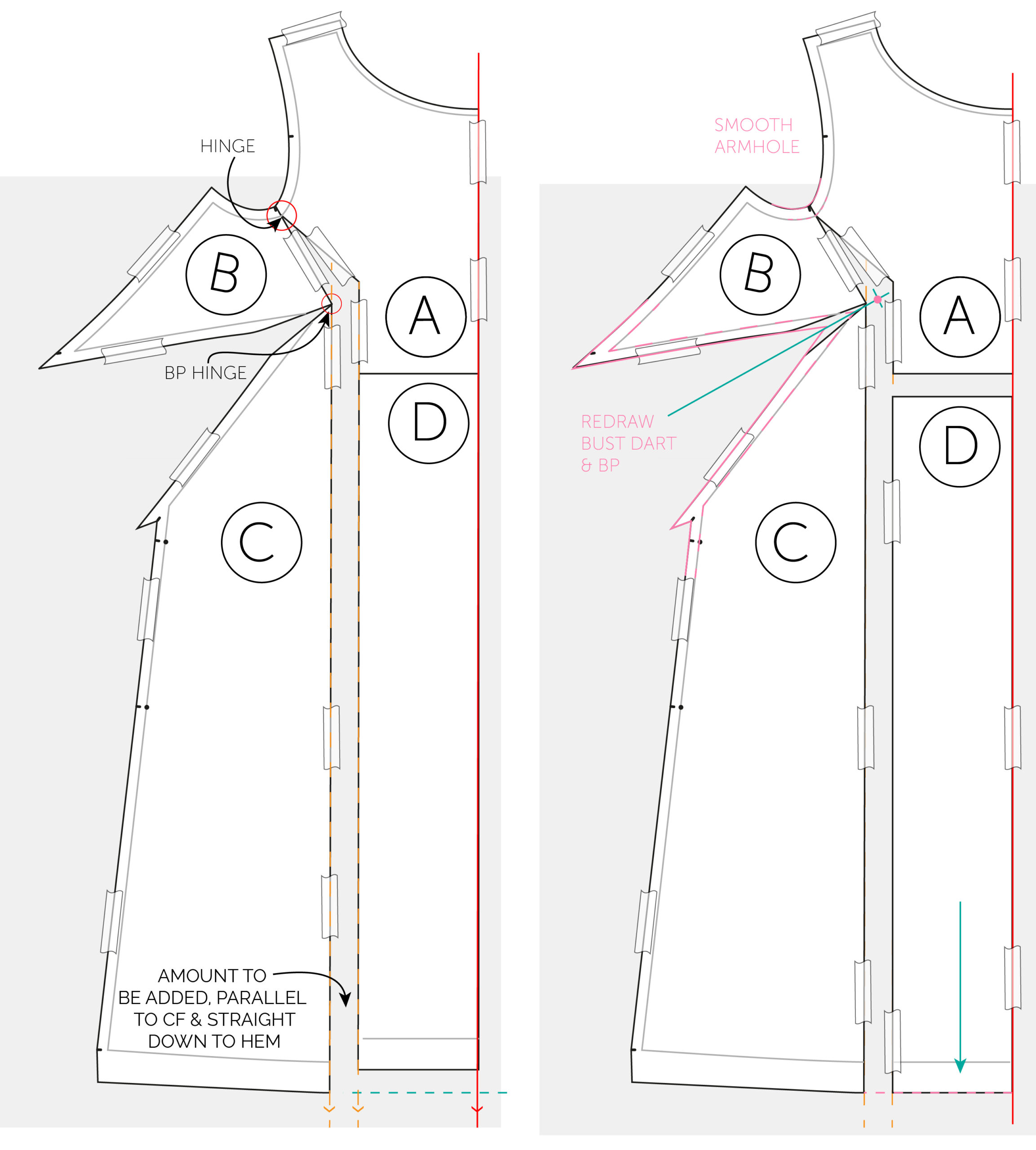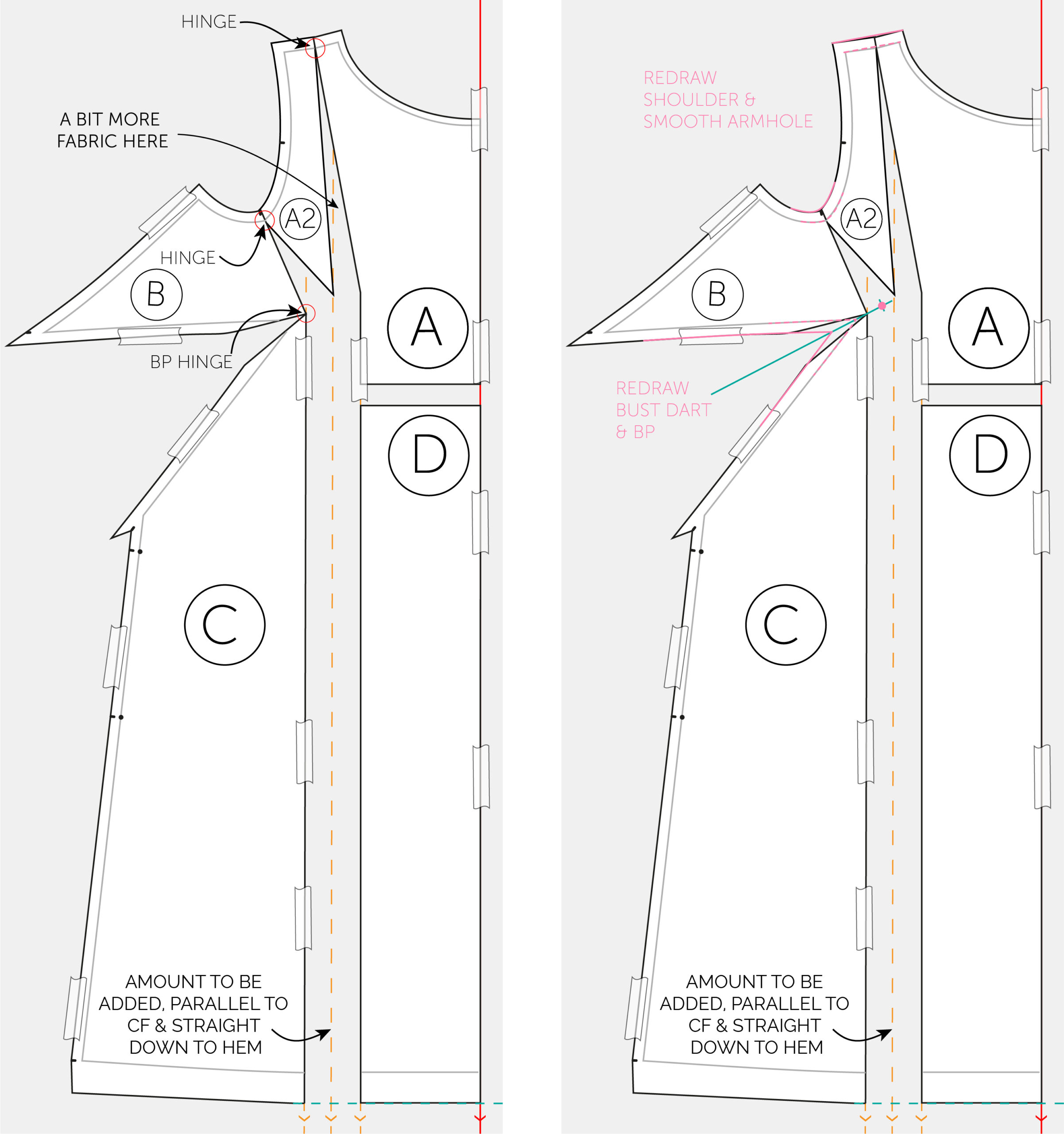Open LINE 1 out the amount you need to add for your FBA, pivoting the pattern from the hinges at the armhole and BP. Keep SECTION C parallel the with CF. Let front section slide upwards and allow the bust dart to open wider to keep pattern flat.