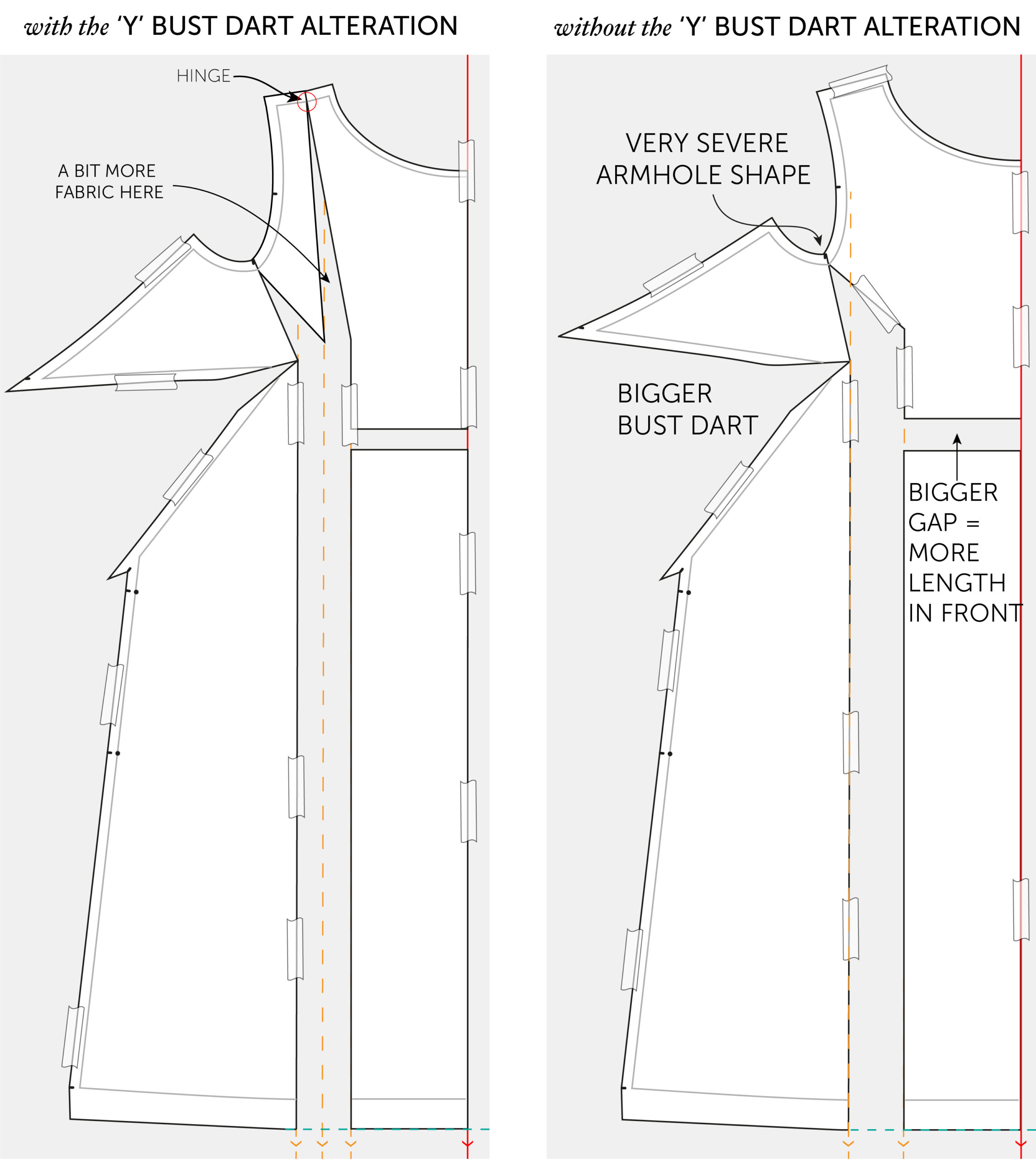 On the left is with the ‘Y’ dart and on the right is without. You can see how large the bust dart on the right has become without using the ‘Y’ dart method – potentially that could be one pointy dart. But the real worry is that armhole shape, it’s just too severe to be a happy bunny later. Again take the time to toile and see what works for you, but I’m recommending giving the ‘Y’ dart method a try if you are adding over 1½” (3.8cm).