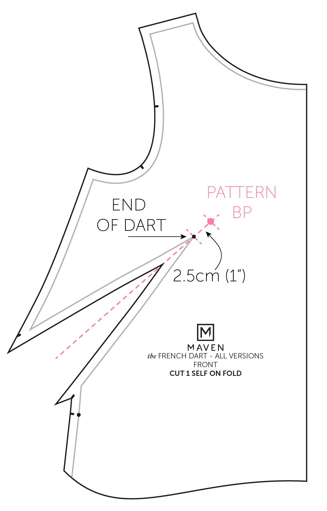 - Draw a line through the centre of the bust dart, and extend it 1” (2.5cm) beyond the dart tip. That is the bust point (BP) of the pattern.