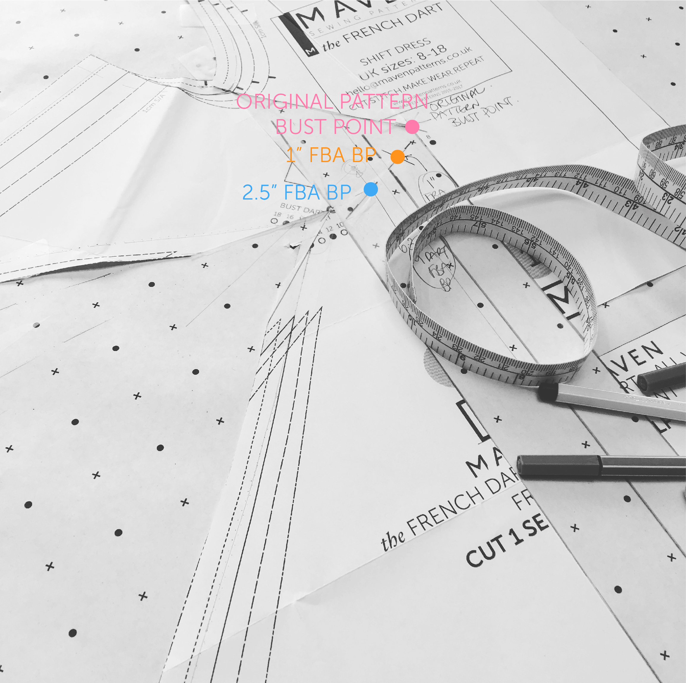 FBA | full bust adjustment SBA | small bust adjustment CF | centre front BP | bust point/apex