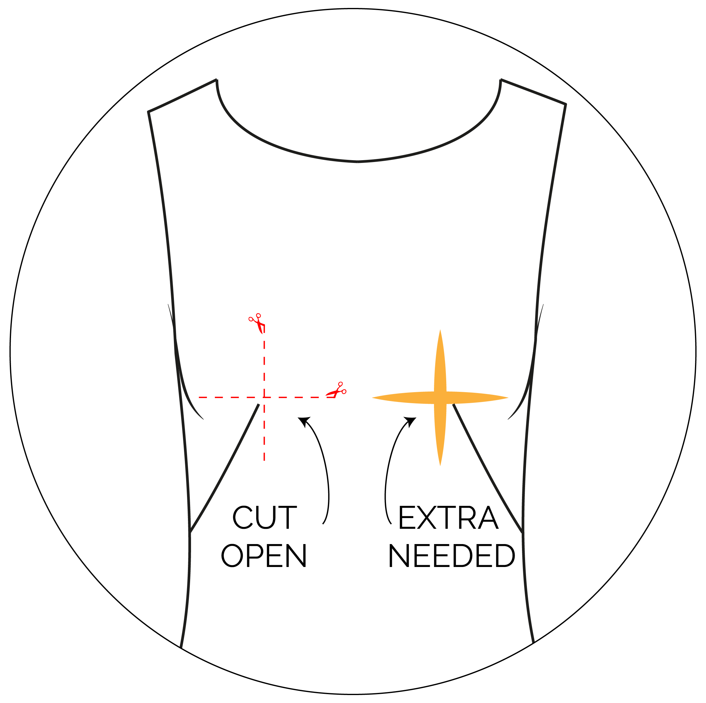 I’ve got 2 options listed below: Either toile and slash open to give an idea, or a bit of Maths. It is very much trial and error the first couple of times until you know what works for you.TOILE: Make a quick toile (just the body, don’t bother with sleeves, collar etc). Try it on and mark your bust point. Cut a cross in the fabric at your Bust Point / Apex, let it spread open and then measure how much extra you need. For an SBA, instead of slashing, pin the excess out of the bust.